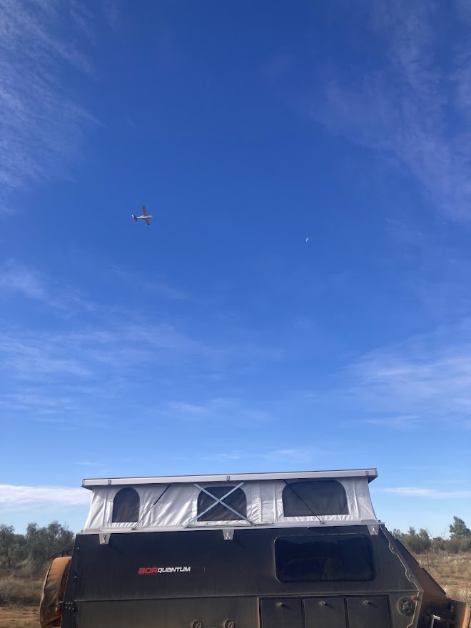 Carried on down to Jundah, almost to Windorah before some green returned to the roadside. Had a back tyre slowly go down. So the tpms caught it at 25 psi. Changed the wheel without drama and carried on to fix it later. Camped by Cooper creek crossing, with the river very full, but dry all round. Not much bird life.