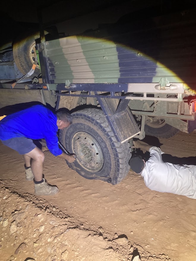 On to Mt Dare finally, after 11/2 hours again with lots of bogs but no dramas. Mechanic was quite happy to service my car and swap tyres over, as well as replacing the rear brake pads. I’ve bought a 285/75 as a second spare, and will probably go that way now as the skinnies aren’t working well. 225/95 is a rare tyre in the bush despite it being the recommended size. The wider tyre has the same rolling diameter as the others, so mixing them won’t be a big issue.