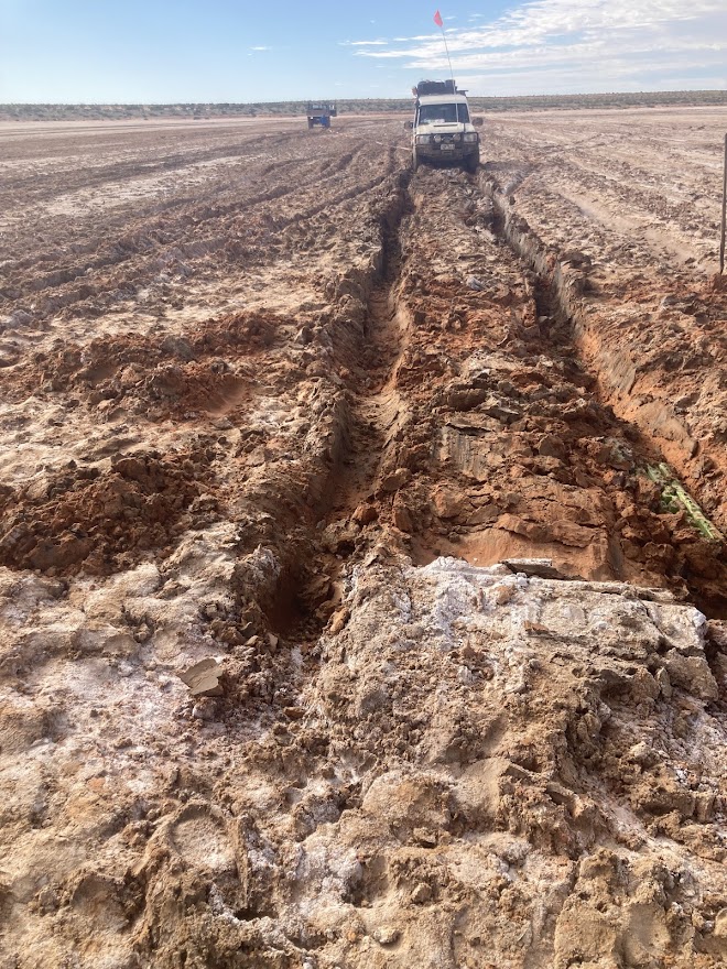 June 7. We set off down the remaining few kms to the Waa line and turned west again. We began with a small clay pan crossed successfully, then an island for a few hundred metres before entering the large clay pan. The track seemed ok but about 400 m into it we dropped on the left side and stopped with the chassis off the ground and all wheels spinning. Bugger.