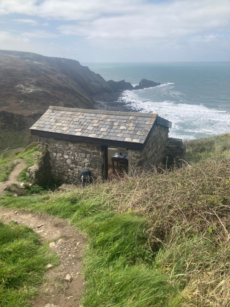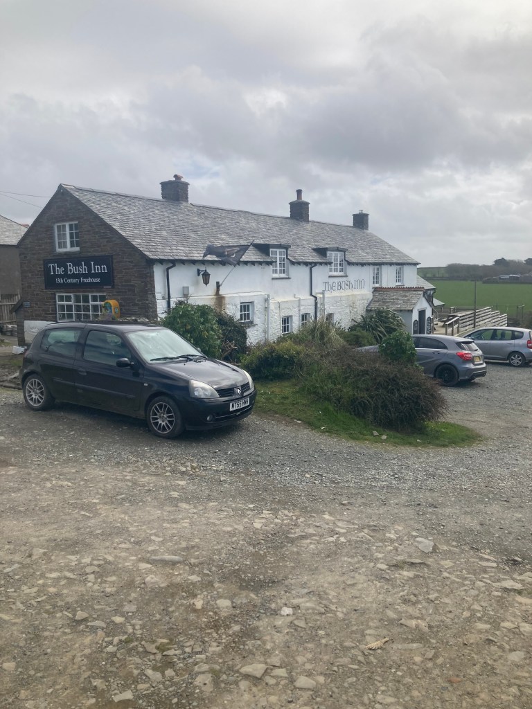 Today was meant to be all the way to Bude, 26 km, but the forecast 80 kph winds and rain made that unattractive to say the least. So oddly for me, planning ahead, I booked the Bush inn online for tonight and the Falcon Inn in Bude for tomorrow. ANZ let me down again, sending verification codes to my Aussie number. $10 a day for roaming privilege is just over the top. I was able to make the calls from the shelter of the Poets Hut on the clifftop.