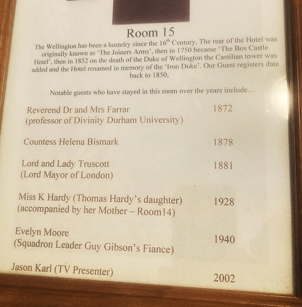 A hard day of steady walking with a half hour break for lunch at Crackington Haven, rolling into the Wellington hotel at 5:30. The coastal cliffs just continued to get more spectacular, but with all the ups and downs the last 10 km took 4 hours. The hotel was renamed to honour the Iron Duke after his death in the 1850’s. It had been a hotel for 200 years before that. My room had a list on the wall of the honoured guests who had stayed there, but the room looked like servant’s quarters; a small room up a narrow staircase, but with a modern bathroom.