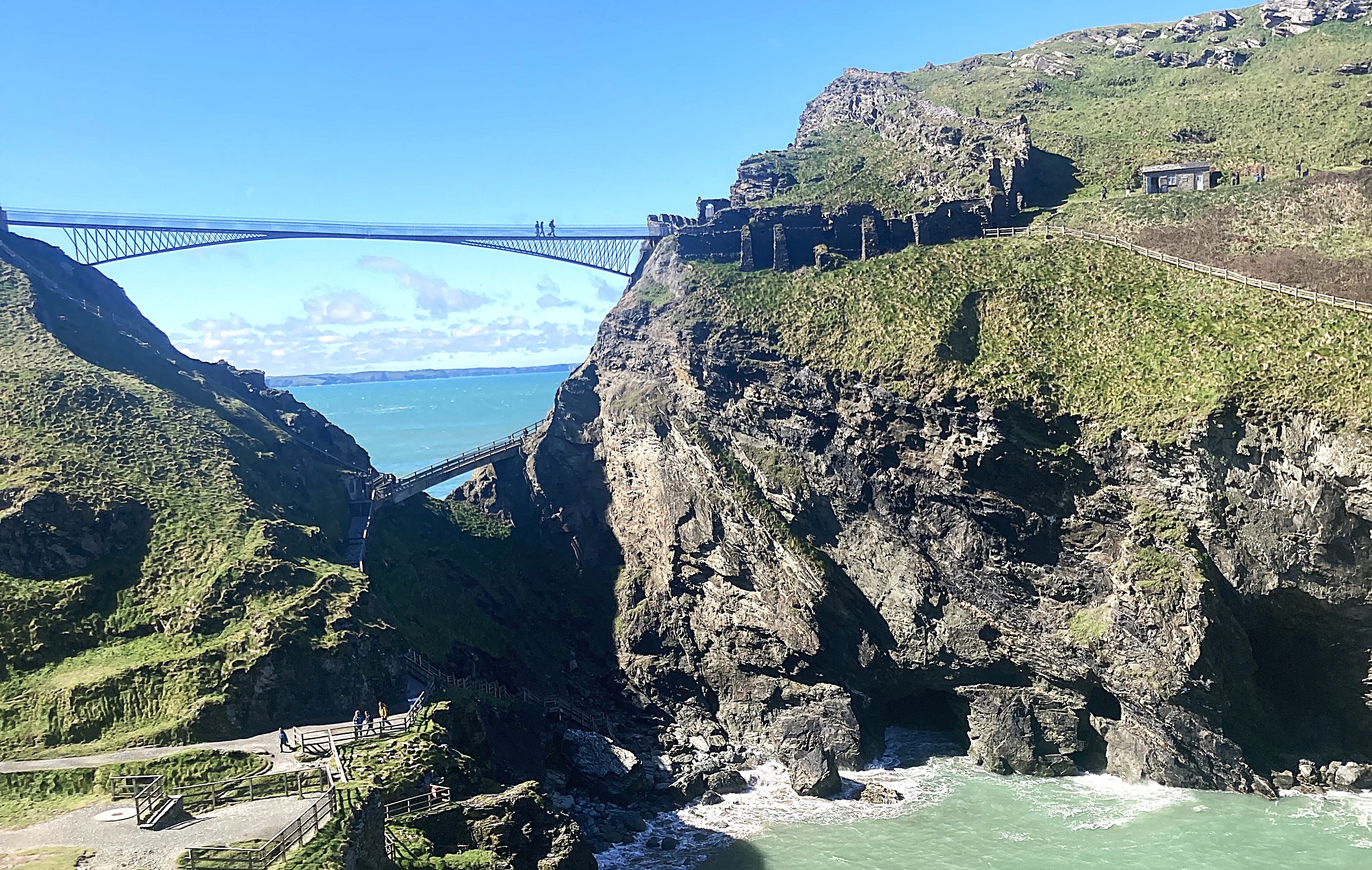Comfortable walking to Tintagel, with a few long but steady climbs. It is easy to see how the entire island was fortified, with many ruined stone walls in strategic places. No places for horses on the island, which makes it a strange location for a stronghold. The new bridge across to it was the most spectacular part of the scene. There were hundreds of people thronging the village and queueing up to cross over at £18 per person. I kept going.