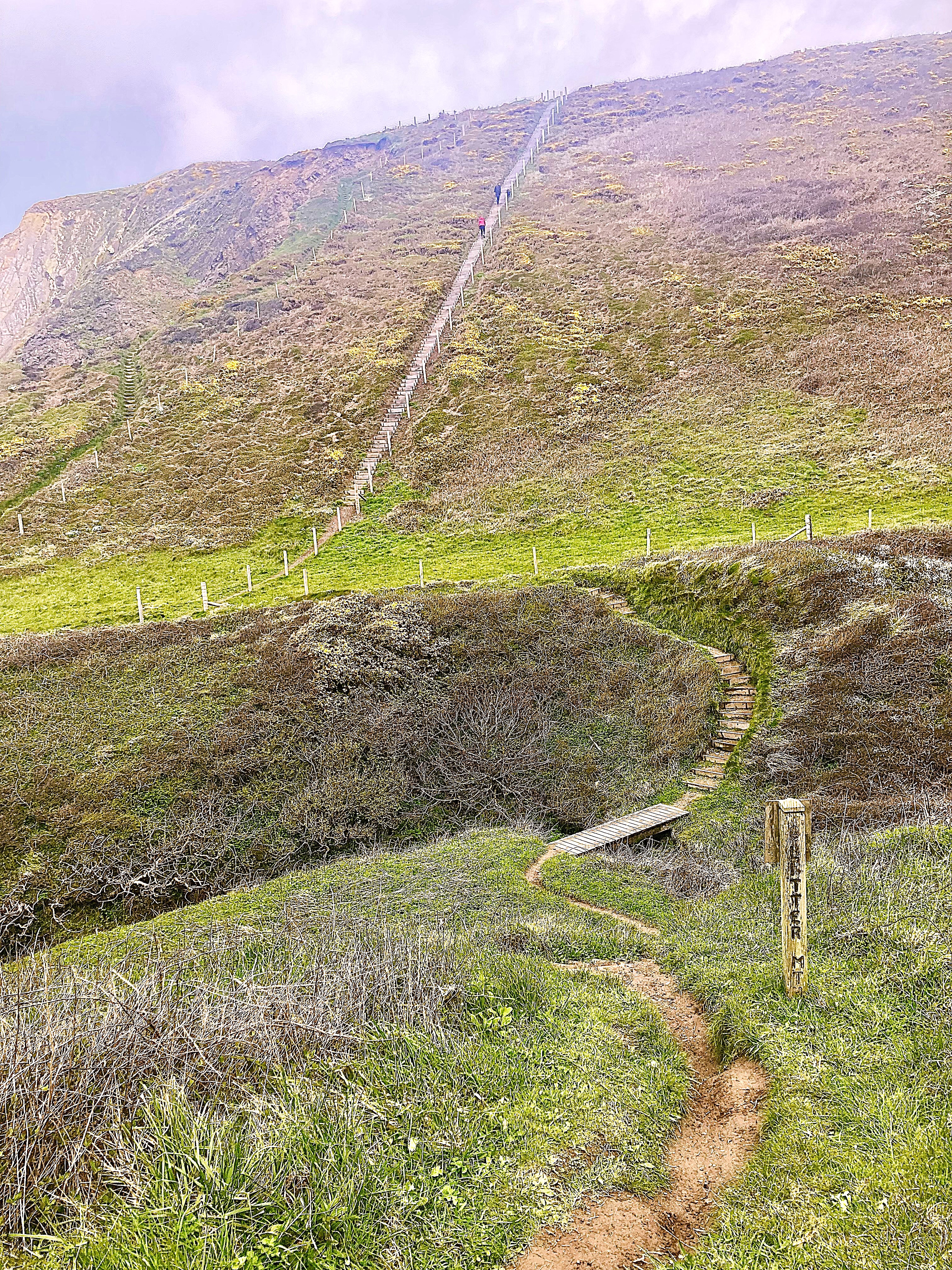Several more descents and climbs of 150m and more followed quickly, leaving me exhausted before even reaching the main climb called the Great Hangman. With nowhere to camp I had to keep going up and over, then down a long ridge to Combe Martin and a campground by 6. Noodles for dinner. Repaired my sleeping bag with a row of safety pins, then dressed in long johns and puffer jacket with a beanie. Felt a little overdressed, but I slept right through. I shared the camp kitchen with another through hiker, Anna, but she was skipping through to the next town hoping her back would recover from a rest.
