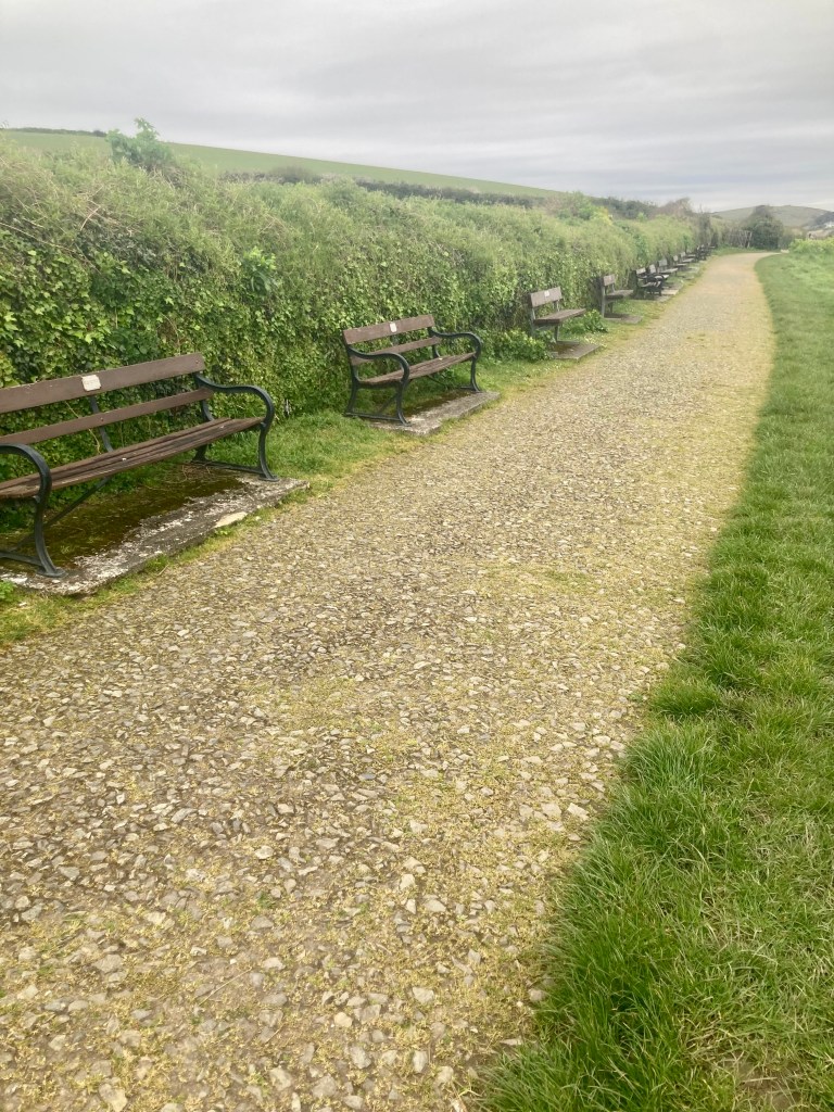 Walked out of Padstow on a sealed path lined with hundreds of benches, each with its memorial plaque, overlooking the Padstow Inlet and the Camel River. It was low tide, so the ferry route looked to be walkable.