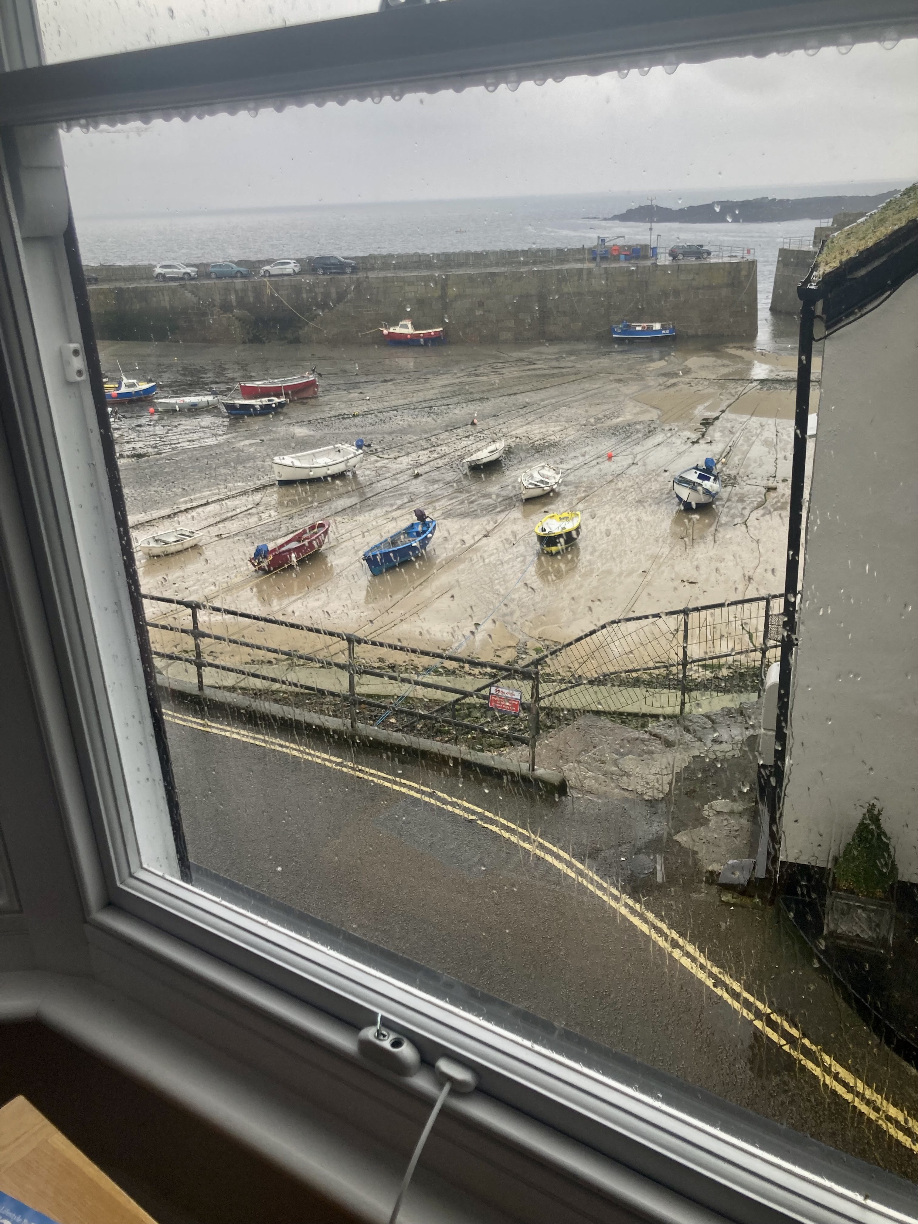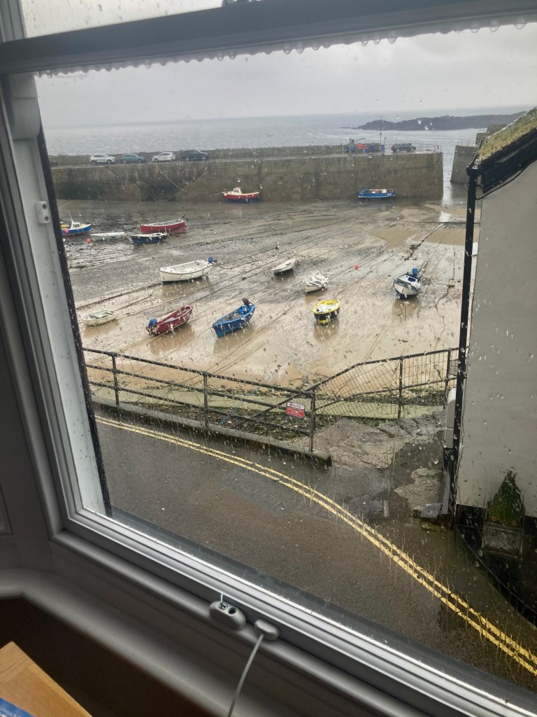 Headed off by 8:30 into not quite drizzle, very slow going on rough and rocky paths, taking 31/2 hours for the 9 km to Lamorna and a café for soup, a huge meat pasty and a coffee. Feeling bloated for the next 3 km to Mousehole, pronounce Mouzel, and decided to stop in the hotel on the waterfront.